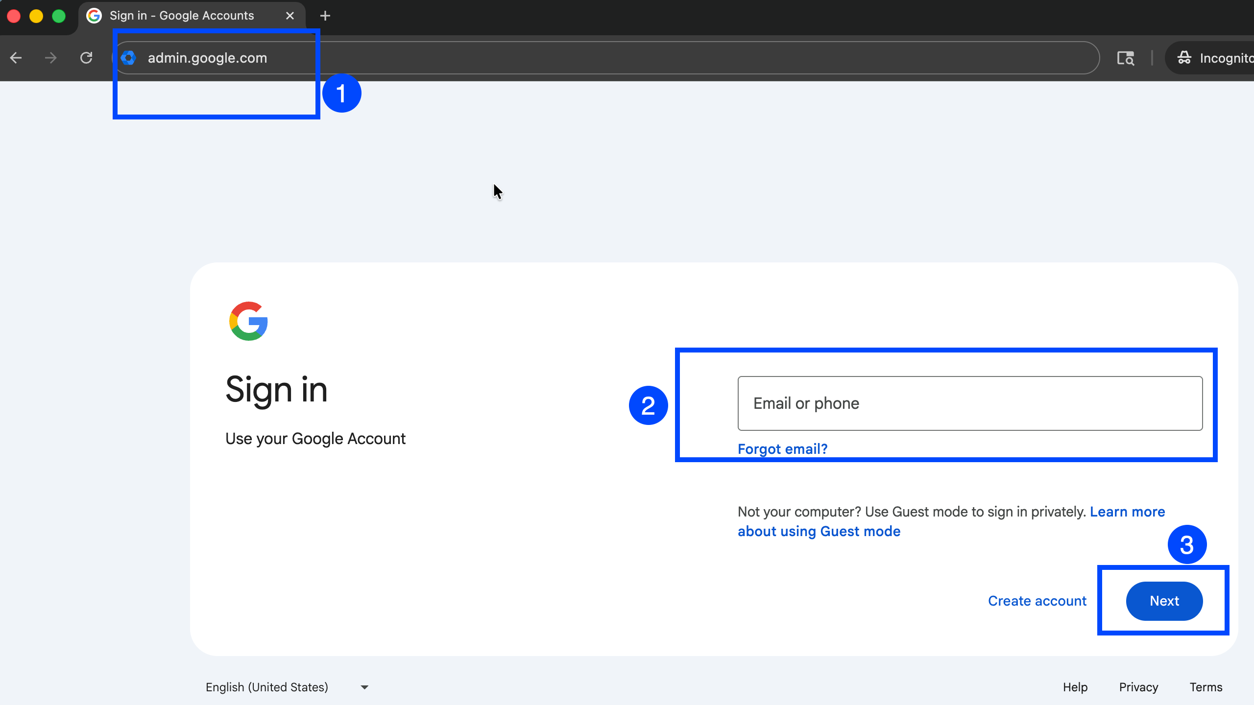 You must login to Google Workspace Admin Console (admin.google.com) with your Super Administrator account.
