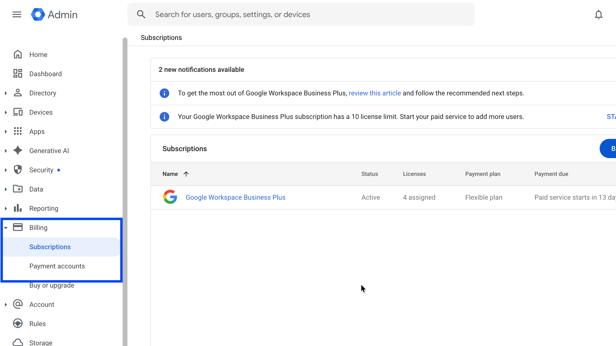 Please navigate to the Billing section (as shown in the screenshot below and click on Subscriptions, here you will see your Google Workspace subscriptions. The cancellation process is the same regarding of your subscription plan (e.g. Business Starter, Standard or Plus).