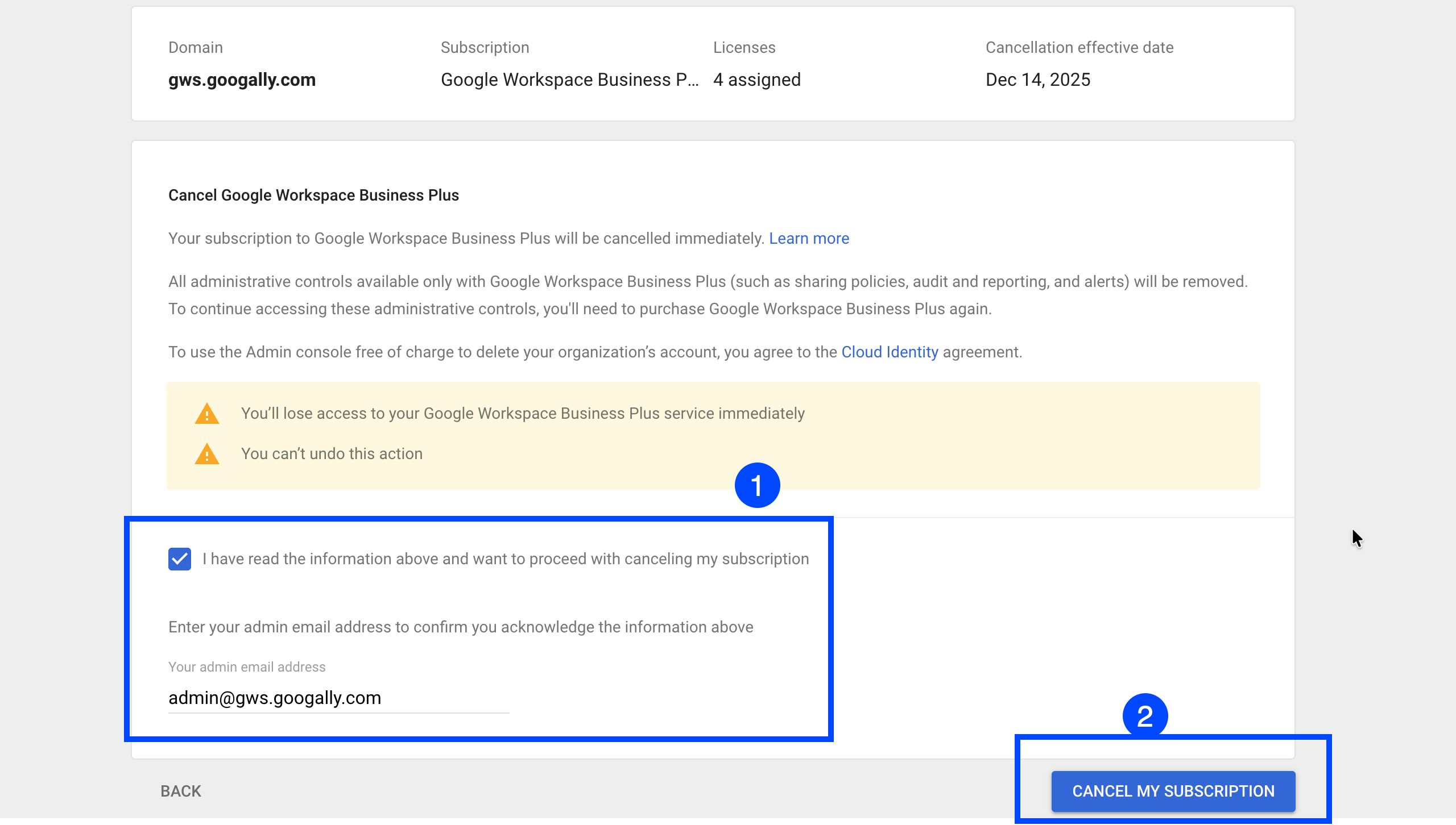 This is your final step to cancel your Google Workspace cancellation where you will need to agree to cancellation impact and also put your Administrator email address and click on cancel my subscription button as shown in this screenshot.