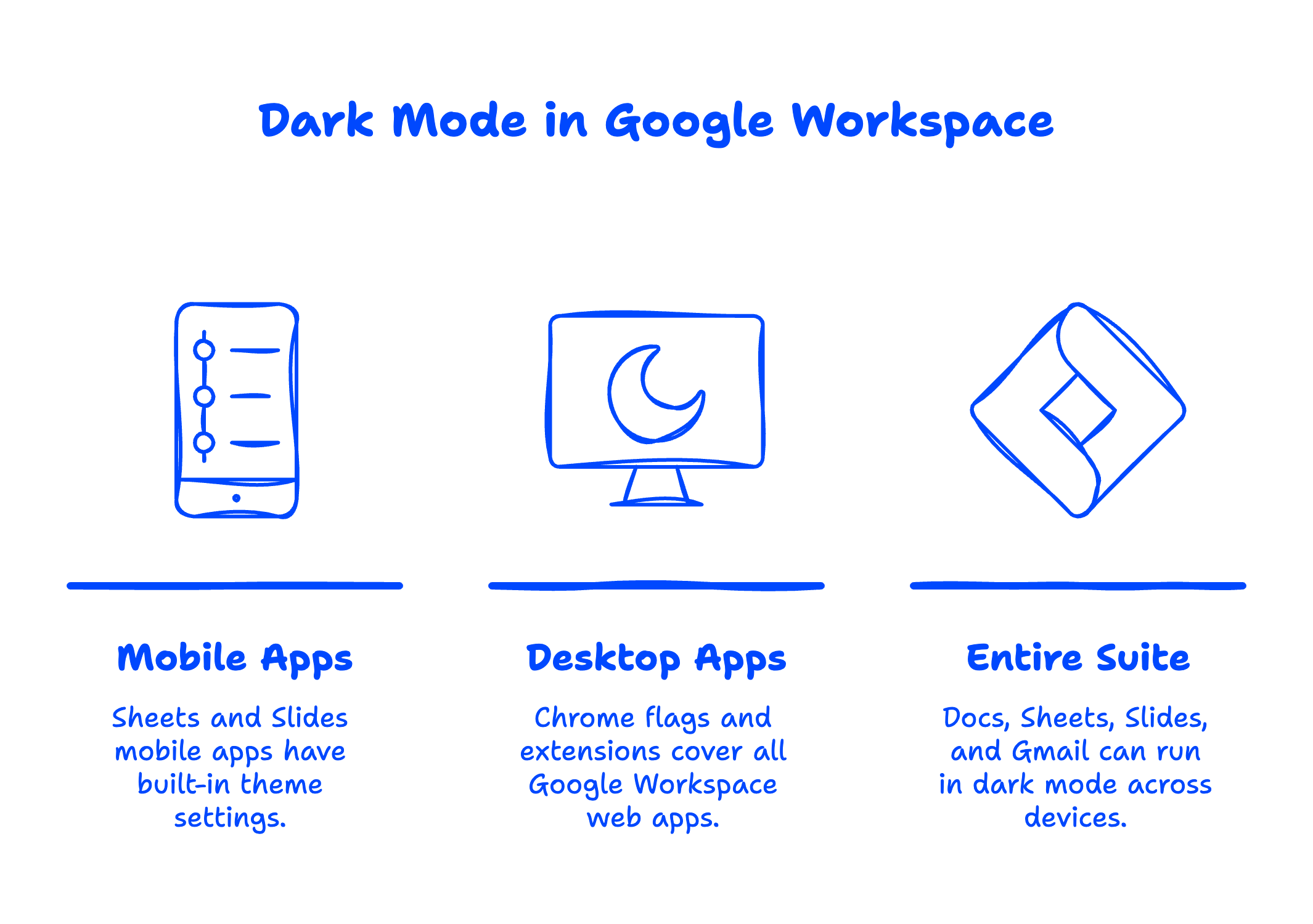 If you're using Google Workspace for your business, this means your entire productivity suite — Docs, Sheets, Slides, and even Gmail — can run in dark mode across all your devices.