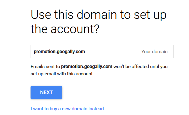 Google is just confirming that you are going to use the domain that you have just entered for managing your email. Google again offers you to buy a new domain name in case you want a different domain name for your email address. If not, click “Next”.