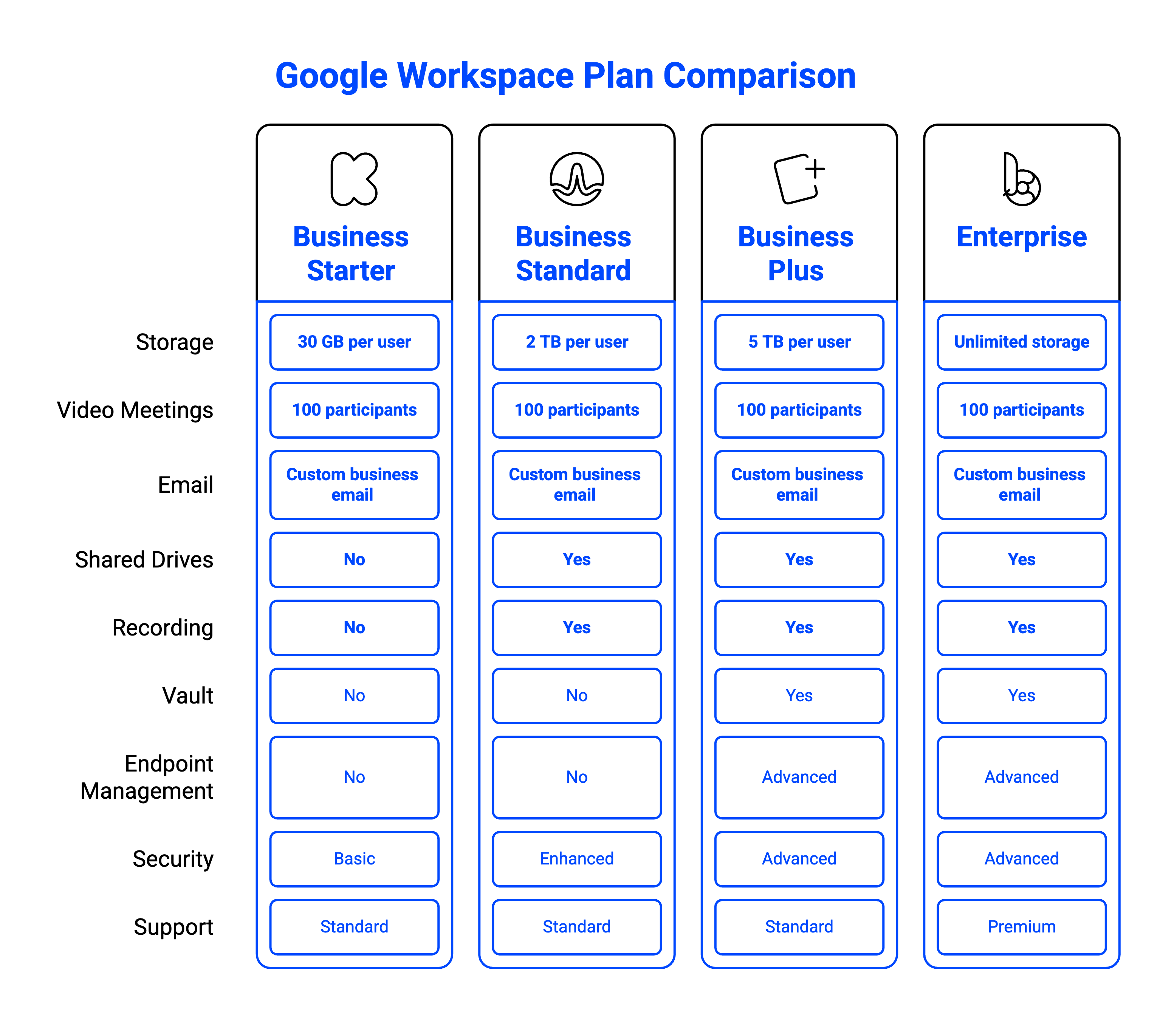 Google Workspace offers several plans, and the right one depends on your team size, storage needs, and feature requirements. For most small businesses, Business Starter or Business Standard hits the sweet spot.