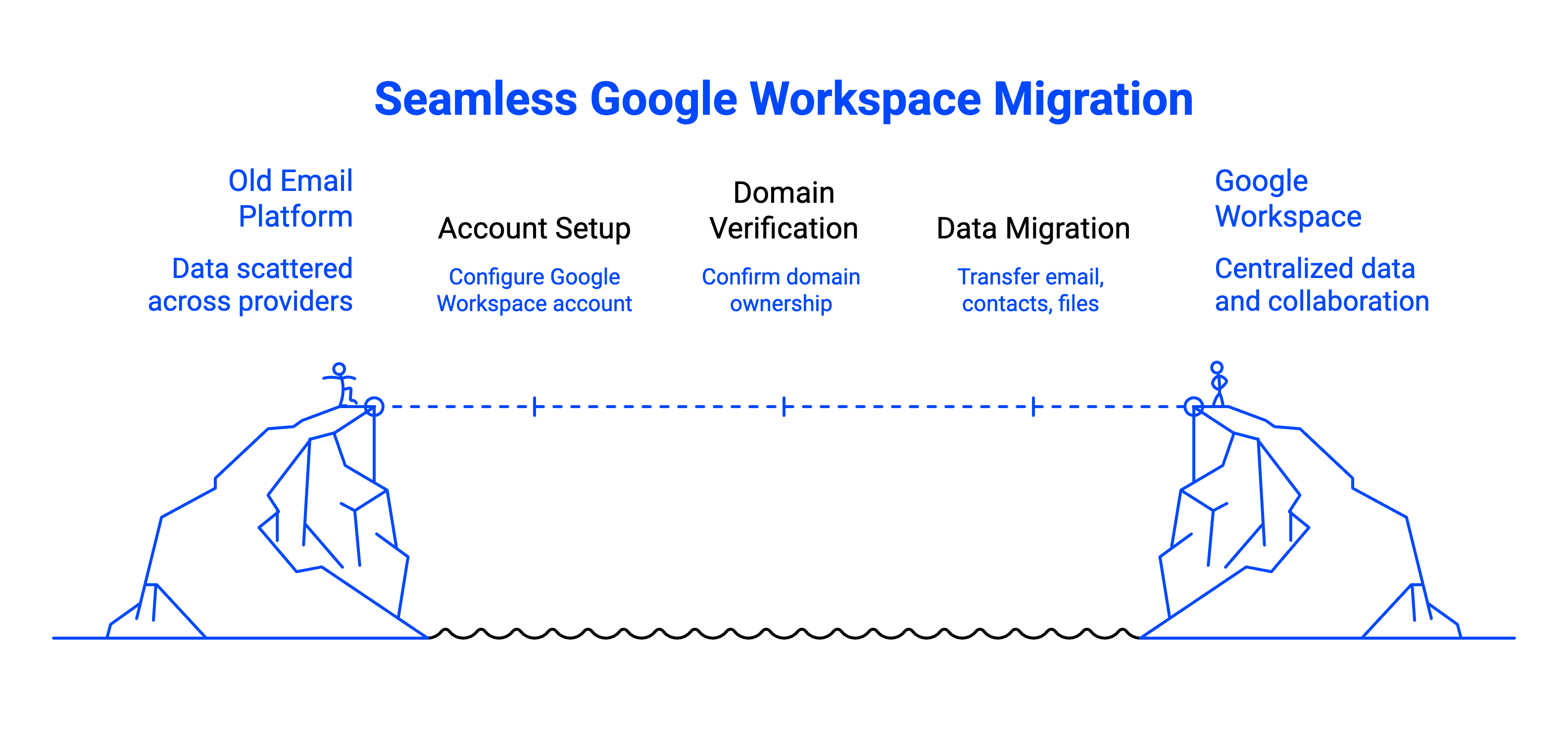 Migrating to Google Workspace is straightforward, especially with the right help. The process typically involves setting up your Google Workspace account, verifying your domain, migrating your existing email and files, updating your DNS records (specifically your MX records), and getting your team onboarded.