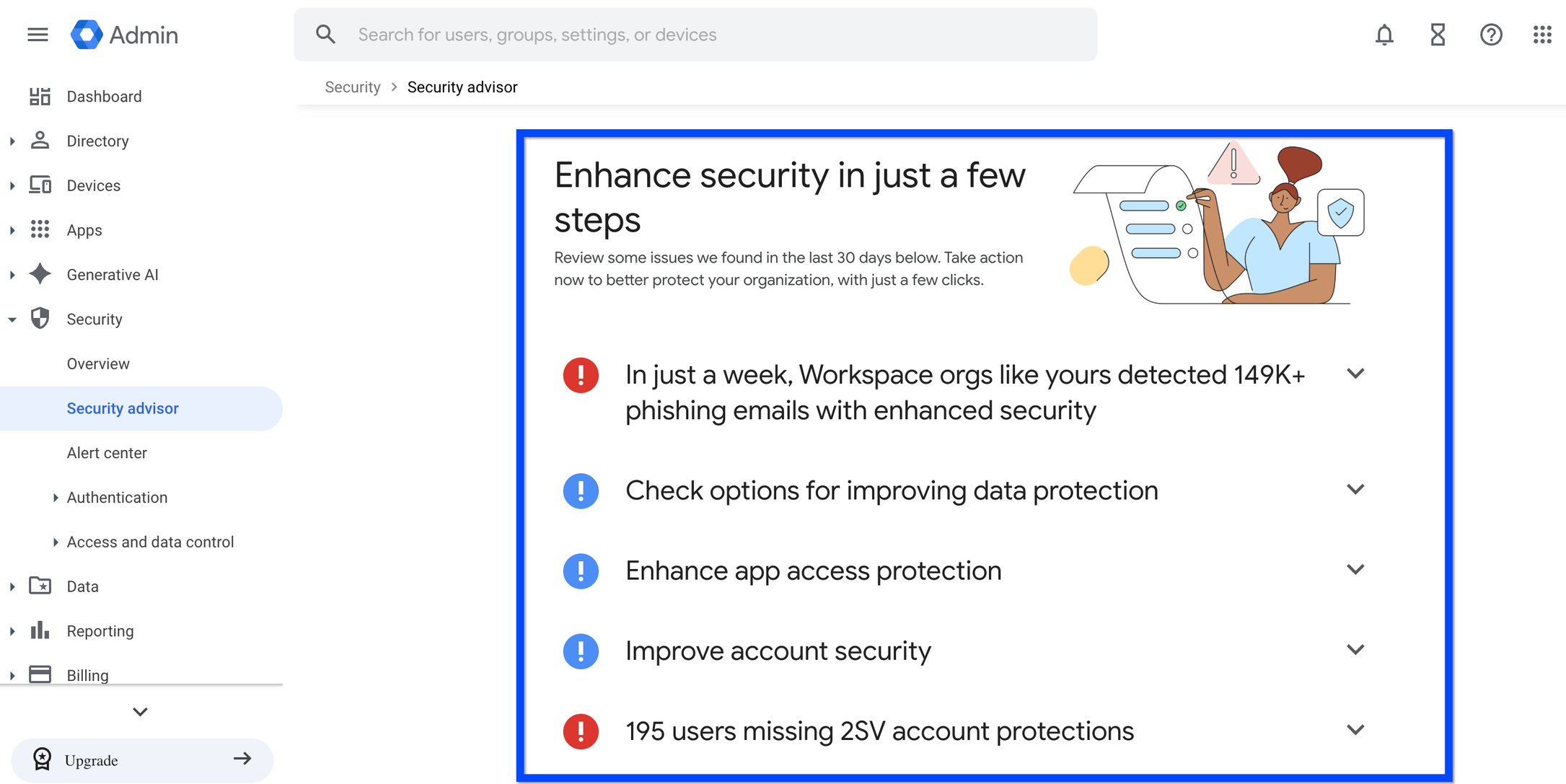 Beyond these, you also get access to Google's Admin Console — a centralized dashboard where you (or your IT person) manage users, security settings, devices, and more.