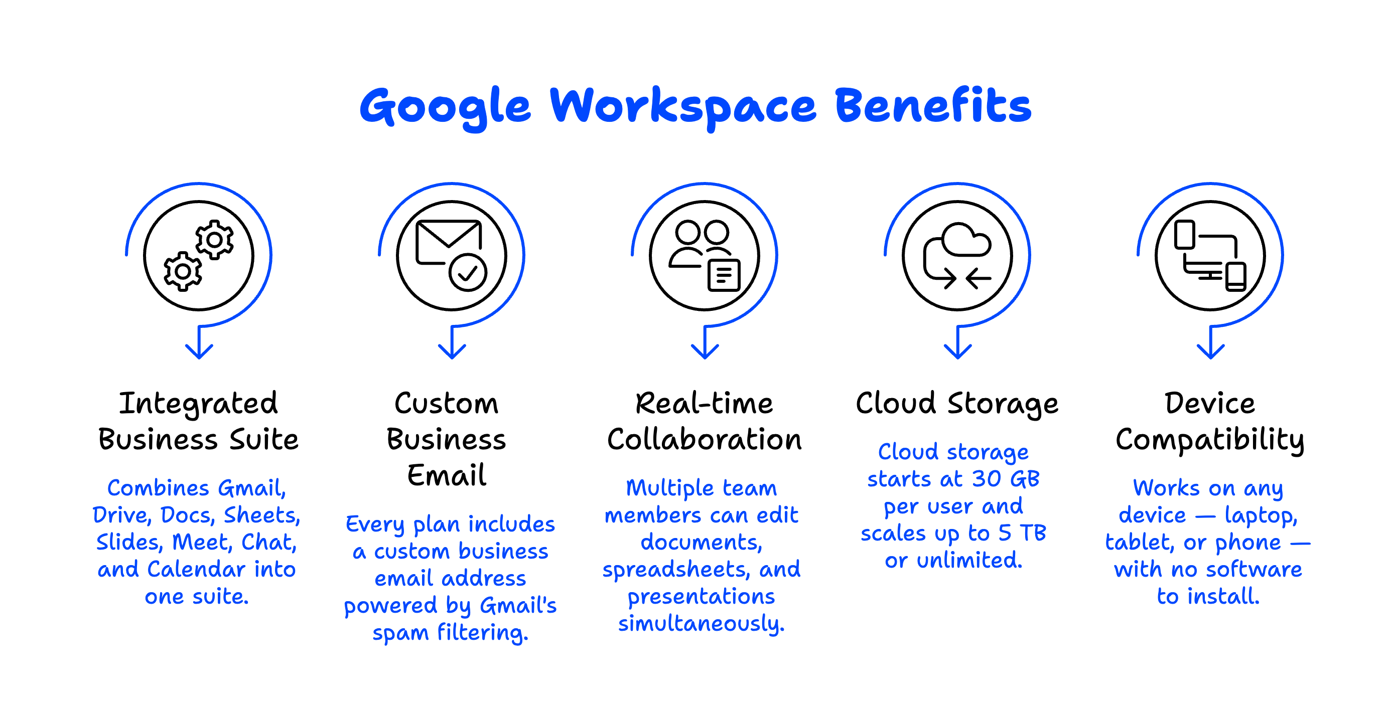 What is Google Workspace used for? In short, Google Workspace is an all-in-one cloud platform that gives your business professional email, file storage, video conferencing, team collaboration, and productivity tools — all under your own domain name.