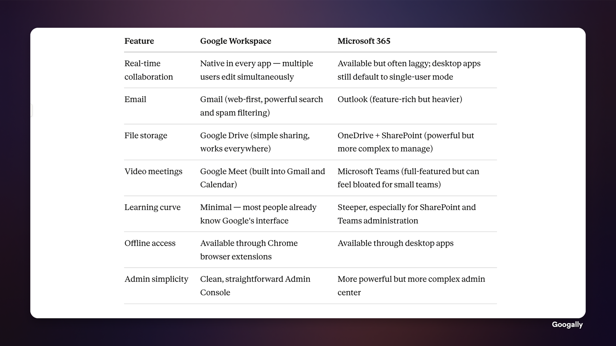 This is one of the most common questions we hear from businesses considering a switch. Both platforms offer email, cloud storage, and productivity apps. The key differences come down to collaboration, simplicity, and how your team actually works.