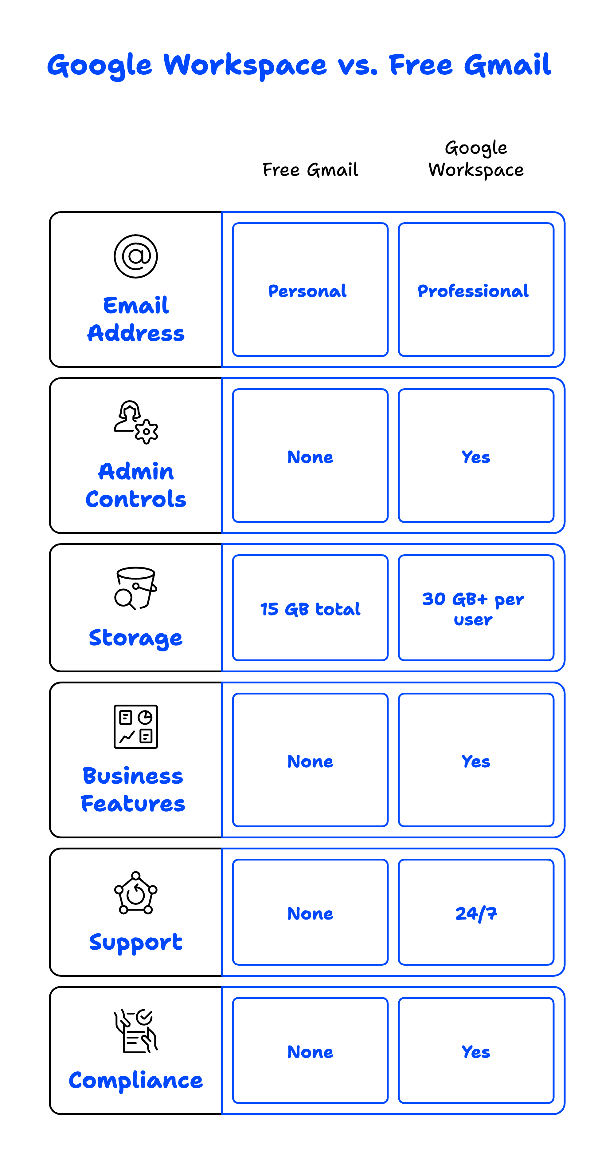 With Google Workspace, you get email at your own domain (team@yourcompany.com instead of yourcompany@gmail.com), which immediately boosts your credibility with customers and partners. But the differences go far beyond the email address: